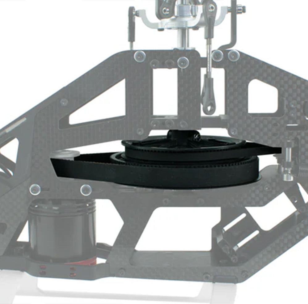 The Protos 380 implements a robust twin belt transmission, with auto tail belt tensioner. This translates into thousands of maintenance-free flights and whisper quiet transmission. With the lack of gear mesh, the Protos 380 can handle huge power, while delivering it with no transmission noise. A robust one way bearing assembly is located in the main pulley assembly. The low drag setup allows great autorotation performance in a small package.