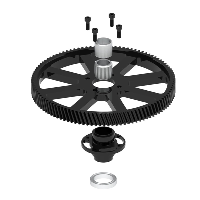 The motor mount is positioned close to the helicopter’s center of gravity for optimal balance and handling. An integrated support bearing on the pinion stabilizes the motor shaft, ensuring precise gear mesh, reduced vibration, and extended bearing life—essential for high-power electric setups.